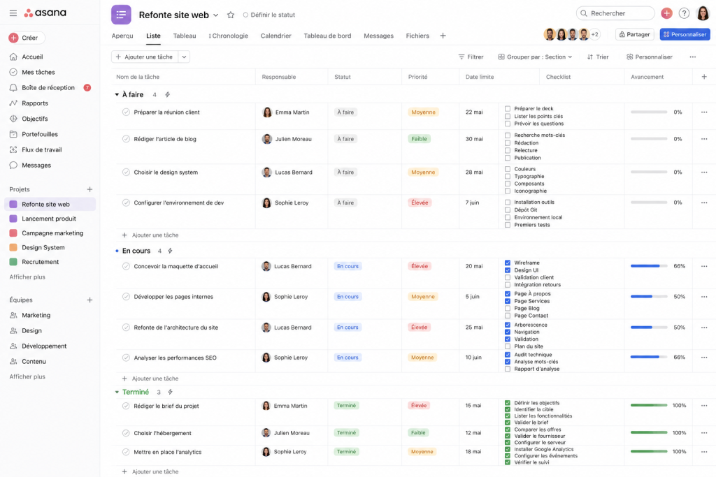 Asana est très apprécié des équipes : chaque tâche peut inclure des sous-tâches sous forme de checklist.